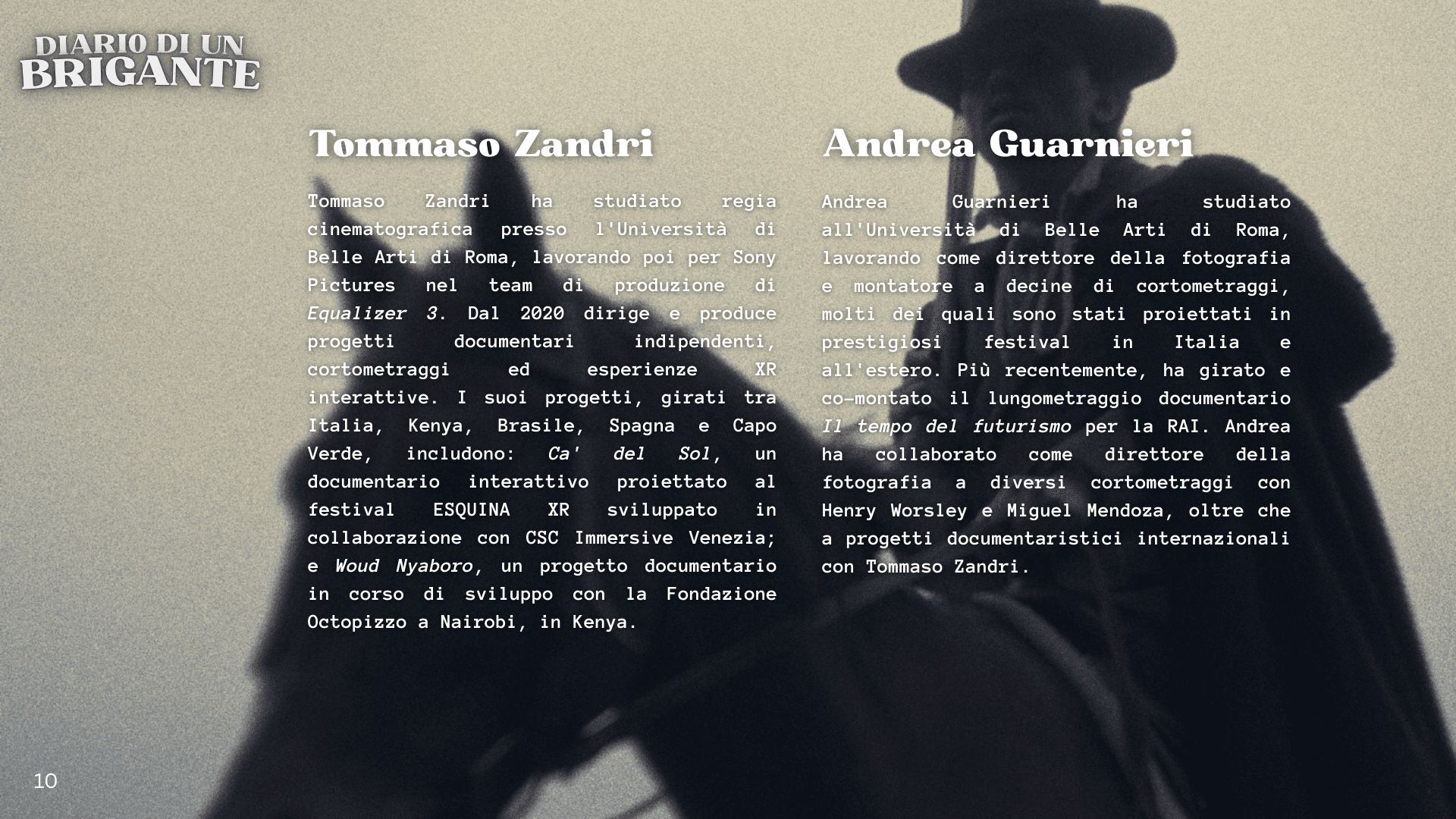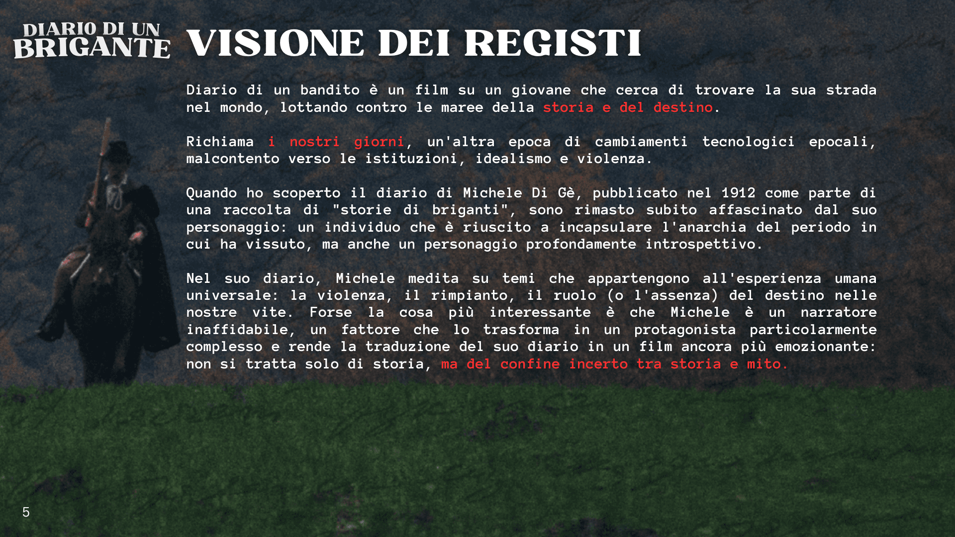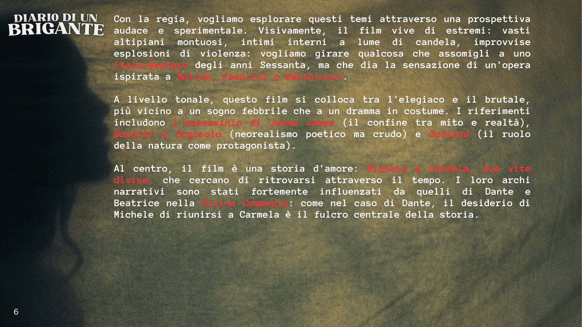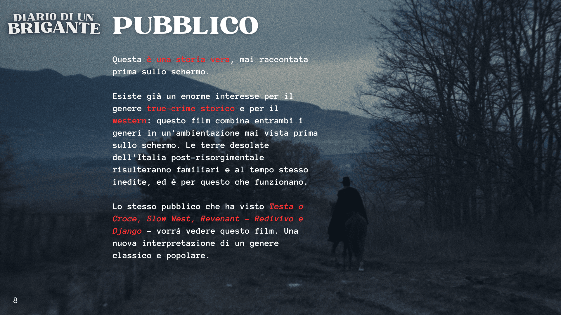 Questa è una storia vera, mai raccontata prima sullo schermo. La gente ama i western e noi amiamo le antiche leggende popolari della campagna italiana: questo film unisce entrambi gli elementi in un’ambientazione mai vista prima sullo schermo. Le terre selvagge dell’Italia post-Risorgimento risulteranno allo stesso tempo familiari e nuove, ed è proprio per questo che funzionano così bene insieme. Se vi sono piaciuti The Revenant, There Will Be Blood o Unforgiven, amerete anche questo film.