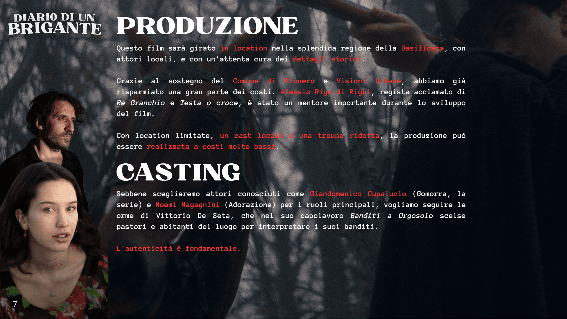 Questo film sarà girato in loco nella splendida regione della Basilicata, con attori locali, e con un'attenta cura ai dettagli storici. Grazie al sostegno del Comune di Rionero e Visioni Urbane, siamo già a buon punto. Alessio Rigo di Righi, regista acclamato di Re Granchio e Testa o croce, è stato un mentore importante durante lo sviluppo del film. Con location limitate, un cast locale e una troupe ridotta, la produzione può essere realizzata a costi abbastanza contenuti.