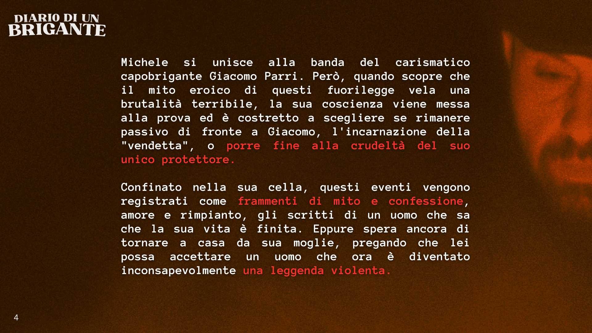 Diario di un bandito è un film su un giovane che cerca di trovare la sua strada nel mondo, lottando contro le maree della storia e del destino. Richiama i nostri giorni, un'altra epoca di cambiamenti tecnologici epocali, malcontento verso le istituzioni, idealismo e violenza. Quando ho scoperto il diario di Michele Di Gè, pubblicato nel 1912 come parte di una raccolta di "storie di briganti", sono rimasto subito affascinato dal suo personaggio: un individuo che è riuscito a incapsulare l'anarchia del periodo in cui ha vissuto, ma anche un personaggio profondamente introspettivo. Nel suo diario, Michele medita su temi che appartengono all'esperienza umana universale: la violenza, il rimpianto, il ruolo (o l'assenza) del destino nelle nostre vite. Forse la cosa più interessante è che Michele è un narratore inaffidabile, un fattore che lo trasforma in un protagonista particolarmente complesso e rende la traduzione del suo diario in un film ancora più emozionante: non si tratta solo di storia, ma del confine incerto tra storia e mito.